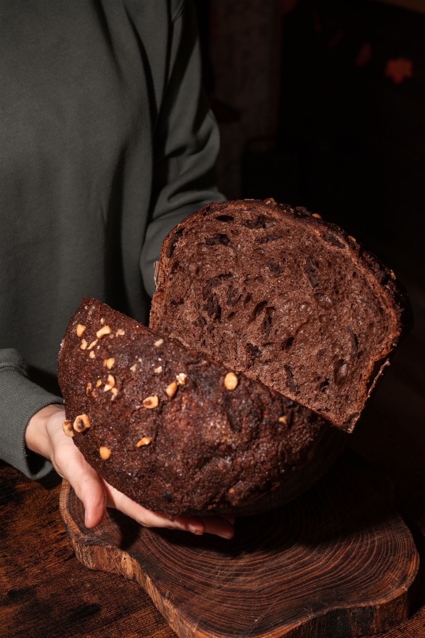 INGREDIENTI: Farina di grano tenero Tipo 0; burro centrifugato da panna; tuorli d’uovo; Cioccolato fondente 80% (fave di cacao Repubblica dominicana), zucchero semolato, pasta di gianduia amara (nocciole 60%); lievito madre (farina semintegrale di grano tenero, acqua); miele; sale; latte in polvere; malto d’orzo; acqua.